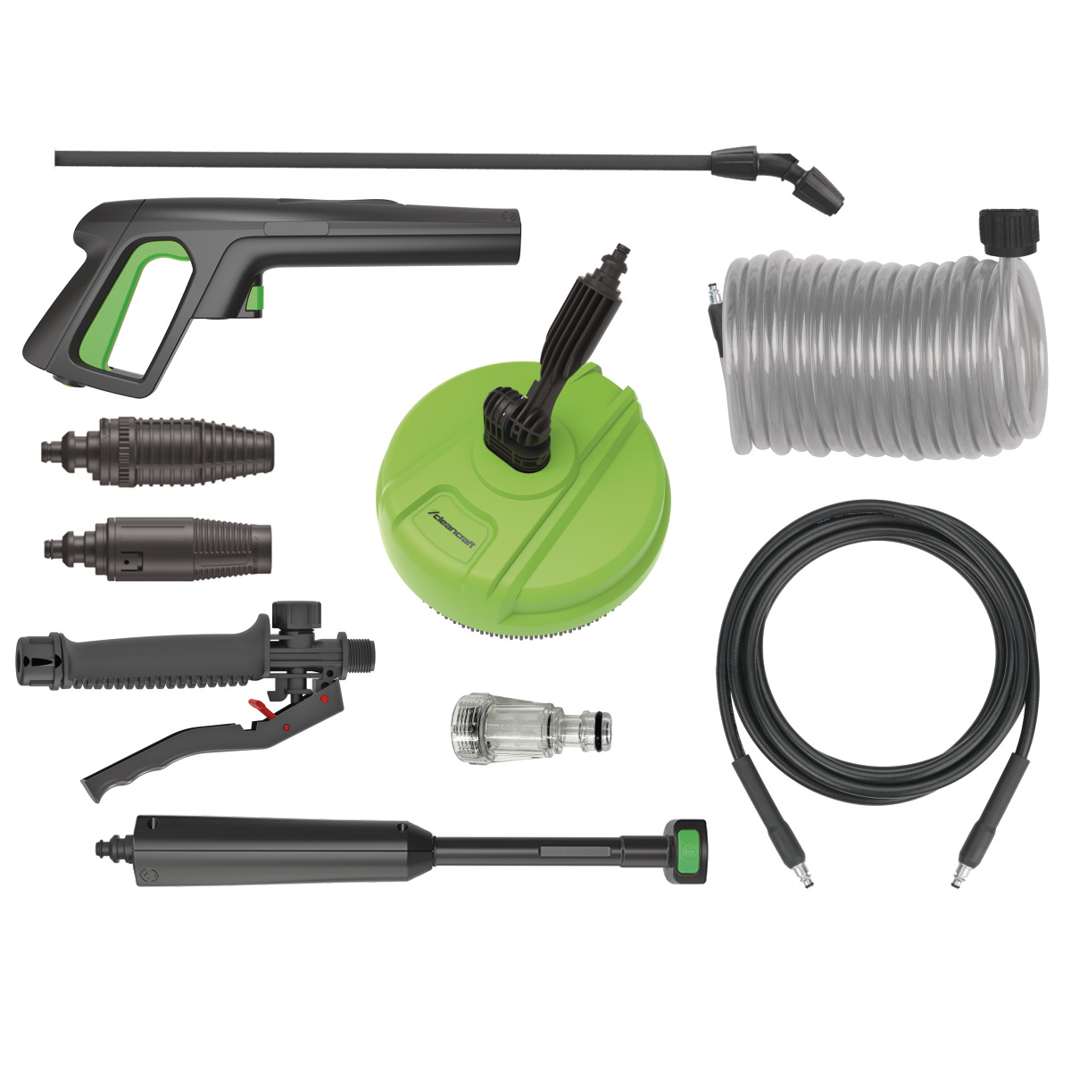 - Praktische Halterungen für Handspritzpistole, Strahlrohr, Hochdruckschlauch und Netzkabel