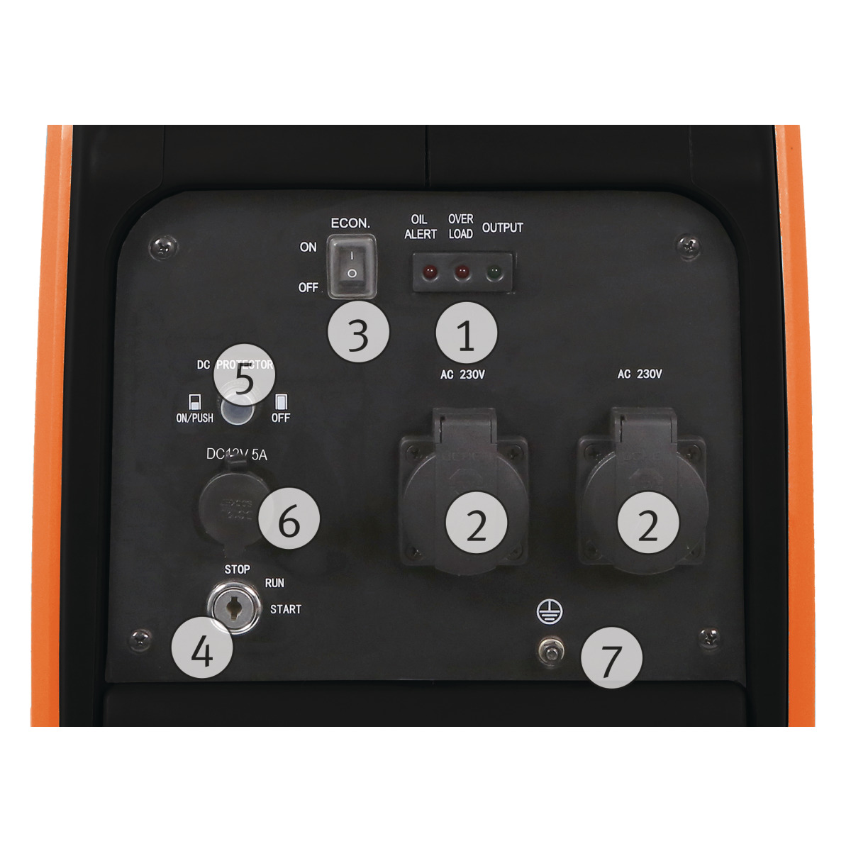 • Kontrollleuchten für Ausgangsspannung, Überlastung und Ölmangel